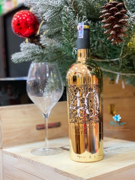 - Thiết kế độc đáo: Toàn bộ thân chai được mạ vàng sáng bóng, là đặc điểm nhận diện thương hiệu riêng biệt của dòng “40 Quaranta Gold”.