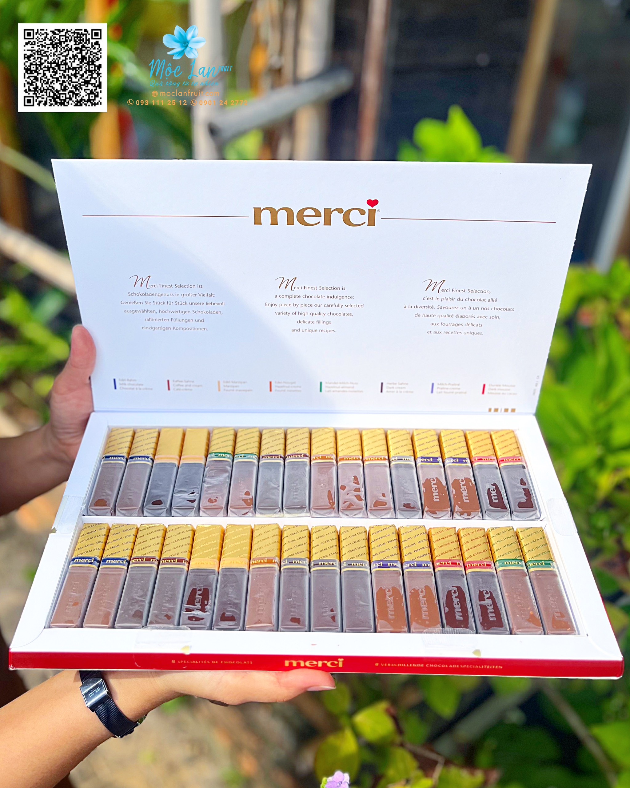 Được mệnh danh là thương hiệu sản xuất bánh kẹo số một tại Đức, những thanh chocolate Merci khiến các thực khách “tan chảy” bởi hương vị ngọt ngào, tinh tế, vô cùng đặc trưng của mình. Cùng với nến và hoa tươi, sự góp mặt của chocolate Merci sẽ biến thời khắc quan trọng giữa hai bạn trở nên nồng nàn và ý nghĩa hơn bao giờ hết.